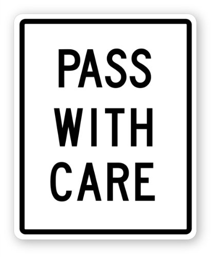 Pass With Care Sign These signs are manufactured on 080 Anodized Aluminum with your choice of Engineer Grade Reflective or Hi-Intensity Reflective and can be used to designate certain. What are the colors of a Pass With Care sign. Other companies use steel which rusts plastic which cracks or warps or a thinner gauge aluminum 060 or.